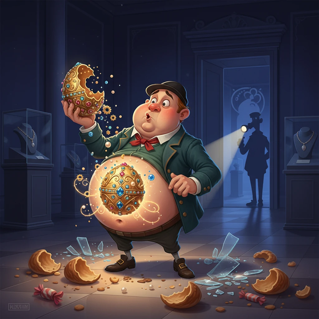 כמובן, היא הזעיקה מיד את המשטרה. השוטרים הגיעו ועצרו את האיש. עכשיו יש להם בעיה קצת מצחיקה וקצת מגעילה: הם יודעים בדיוק איפה התכשיט הגנוב נמצא – בתוך הבטן של הגנב – אבל הם לא יכולים פשוט לקחת אותו. הם צריכים לחכות בסבלנות עד שהטבע יעשה את שלו, והתכשיט ייצא מגופו של האיש באופן טבעי. בינתיים, שוטר שומר עליו כל הזמן כדי לוודא שהתכשיט לא ילך לאיבוד שוב.