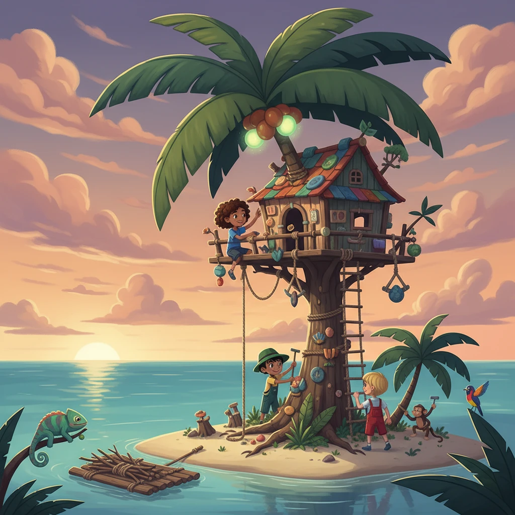 הַחֲבֵרִים בָּנוּ לָהֶם בִּקְתָּה גְּדוֹלָה מֵעֲלֵי קוֹקוֹס. הִיא הֵגֵנָּה עֲלֵיהֶם מֵהַגֶּשֶׁם. הֵם גִּלּוּ שֶׁפַּעַם חַיִּים עַל הָאִי אֲנָשִׁים. הֵם מָצְאוּ תַּרְנְגוֹלוֹת וְסִיר יָשָׁן. זֶה עָזַר לָהֶם לְבַשֵּׁל אֲרוּחוֹת טְעִימוֹת. הֵם גַּם רָצוּ לַעֲשׂוֹת סְפּוֹרְט. הֵם בָּנוּ מִין חֲדַר כֹּשֶׁר קָטָן מֵאֲבָנִים וַעֲנָפִים. אֶחָד הַנְּעָרִים, שֶׁשְּׁמוֹ סִיוֹנָה, אָהַב מְאוֹד לְנַגֵּן. הוּא בָּנָה גִּיטָרָה מֵעֵץ וְשָׂר לַחֲבֵרָיו שִׁירִים בָּעֶרֶב לְיַד הַמְּדוּרָה. הֵם דִּבְּרוּ, צָחֲקוּ וְשָׁמְרוּ עַל הַרְגָּשָׁה טוֹבָה.