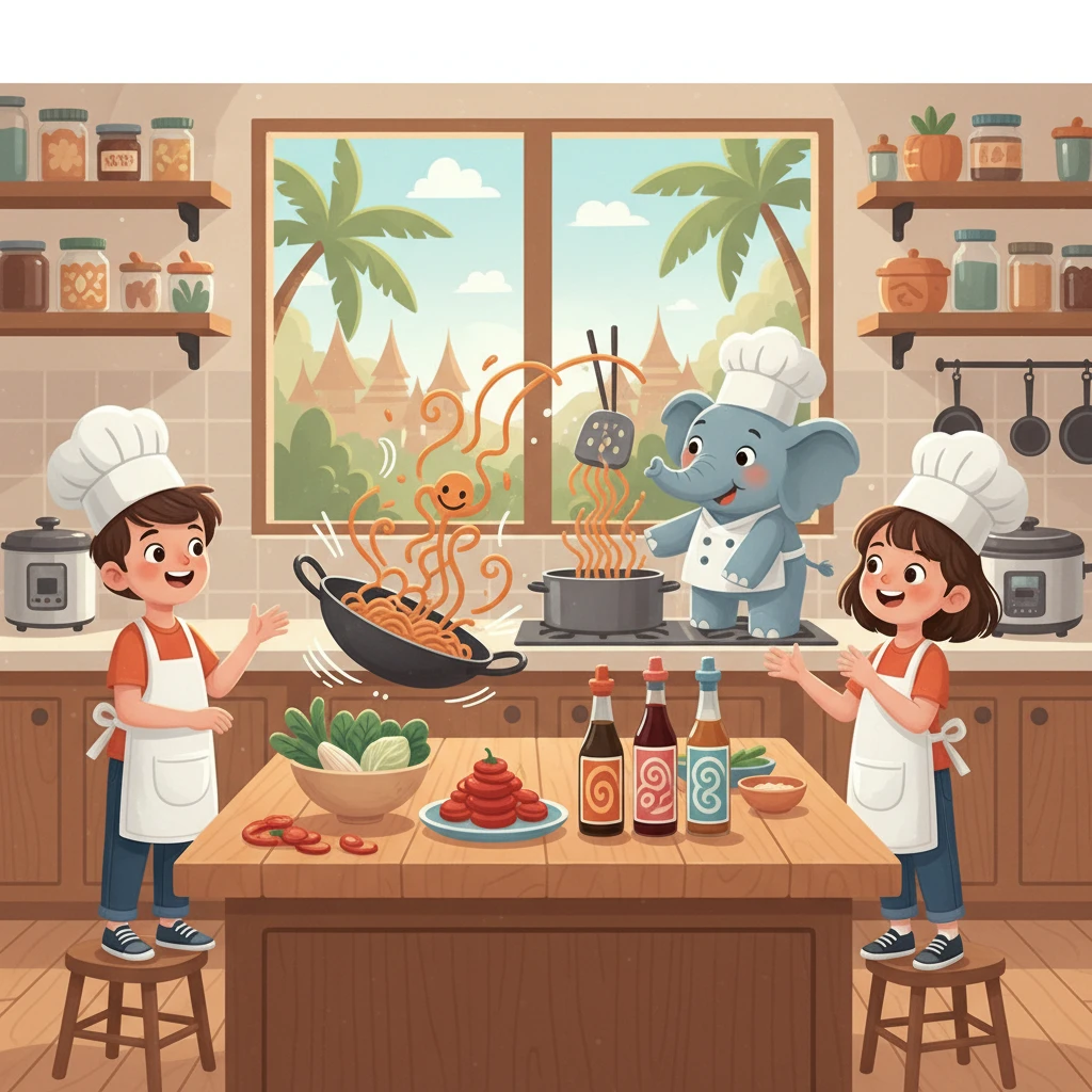 בְּאֶרֶץ רְחוֹקָה וַחֲמִימָה, שֶׁקּוֹרְאִים לָהּ תַּאִילַנְד, יֵשׁ מַאֲכָל מְיֻחָד שֶׁכֻּלָּם אוֹהֲבִים. קוֹרְאִים לוֹ פַּאד תַּאי. זֶה כְּמוֹ חֲגִיגָה גְּדוֹלָה בְּתוֹךְ צַלַּחַת! יֵשׁ בּוֹ אִטְרִיּוֹת אֲרֻכּוֹת שֶׁנִּרְאוֹת כְּמוֹ סְרָטִים, חֲתִיכוֹת עֹף קְטַנְטַנּוֹת, וְגַם קֻבִּיּוֹת לְבָנוֹת וְרַכּוֹת שֶׁנִּקְרָאוֹת טוֹפוּ. הַיּוֹם נִלְמַד אֶת הַסּוֹד שֶׁל הַטַּבָּחִים הַתַּאִילַנְדִים וְנָכִין אֶת הַמַּאֲכָל הַזֶּה בַּבַּיִת, יַחַד עִם אִמָּא אוֹ אַבָּא.
