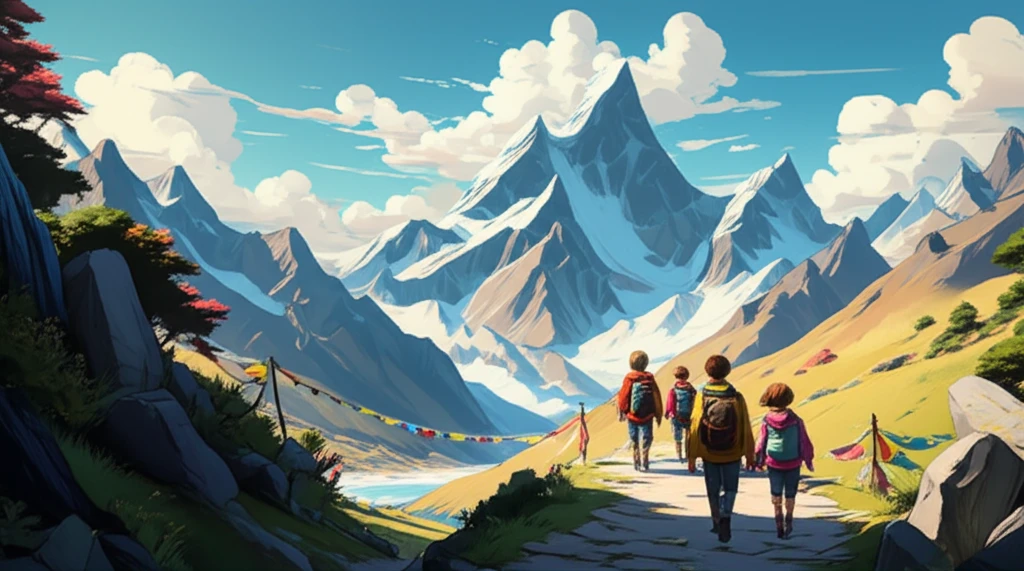 הֵם עָצְרוּ לָנוּחַ הַרְבֵּה. הֵם שָׁתוּ הַרְבֵּה מַיִם. זֶה עָזַר לַגּוּף שֶׁלָּהֶם לְהִתְרַגֵּל לַגֹּבַהּ. בַּדֶּרֶךְ הֵם רָאוּ דִּגְלֵי תְּפִלָּה צִבְעוֹנִיִּים שֶׁהִתְנוֹפְפוּ בָּרוּחַ. הַדְּגָלִים נִרְאוּ כְּמוֹ קֶשֶׁת בֶּעָנָן.