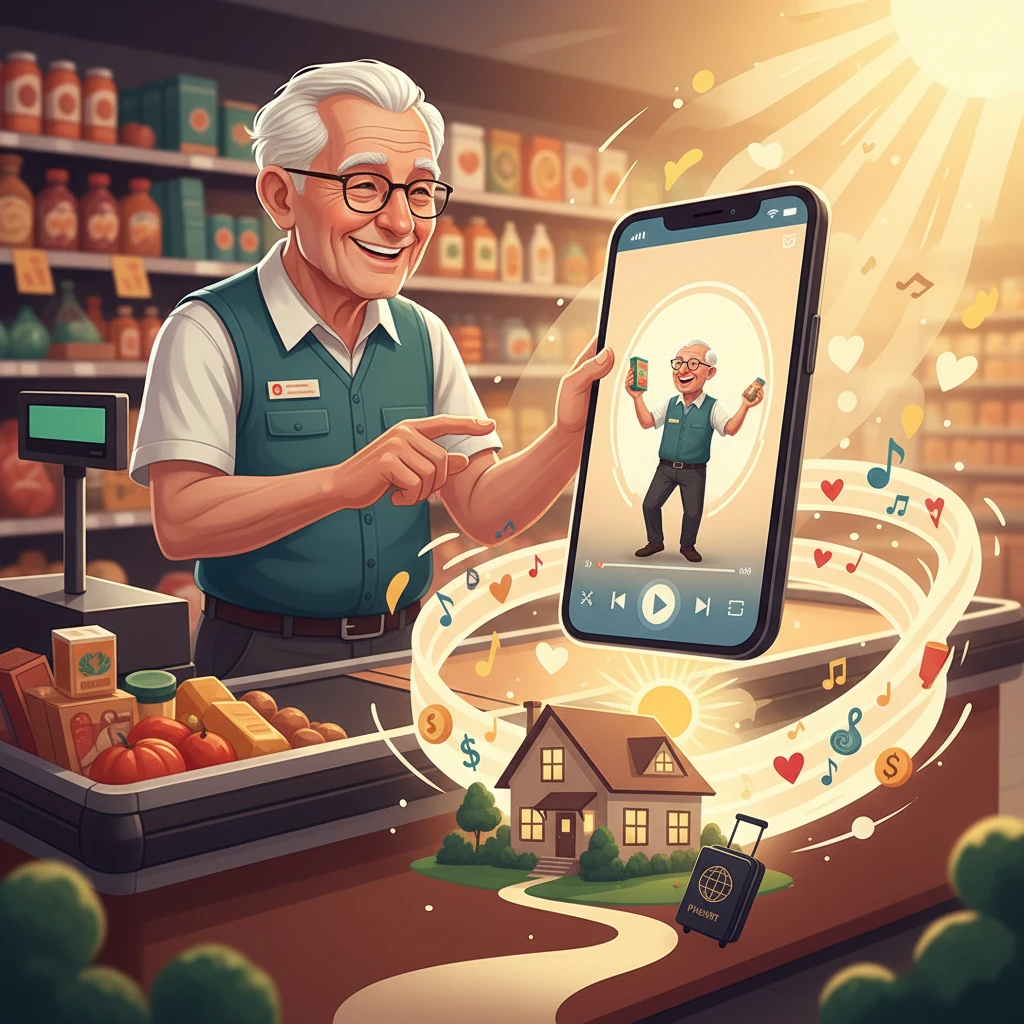 יוֹם אֶחָד, כְּשֶׁסַּבָּא אֶד סִדֵּר שַׂקִּיּוֹת לְאַחַת הַלָּקוֹחוֹת, הִגִּיעַ לַקֻּפָּה שֶׁלּוֹ בָּחוּר צָעִיר וְחַיְכָן בְּשֵׁם סֶם. סֶם, שֶׁבָּא מֵאֶרֶץ רְחוֹקָה אַחֶרֶת שֶׁנִּקְרֵאת אוֹסְטְרַלְיָה, אוֹהֵב מְאוֹד לַעֲשׂוֹת סִרְטוֹנִים קְצָרִים וּמְעַנְיְנִים בַּטֶּלֶפוֹן הֶחָכָם שֶׁלּוֹ. הוּא מַעֲלֶה אוֹתָם לָאִינְטֶרְנֶט, לְאַפְּלִיקַצְיָה שֶׁקּוֹרְאִים לָהּ טִיקְטוֹק. לְסֶם יֵשׁ הֲמוֹן עוֹקְבִים – אֵלּוּ אֲנָשִׁים שֶׁאוֹהֲבִים לִרְאוֹת אֶת הַסִּרְטוֹנִים שֶׁלּוֹ. זֶה קְצָת כְּמוֹ שֶׁלְּכָל הַיְּלָדִים בְּכָל בֵּית הַסֵּפֶר יֵשׁ הַרְבֵּה חֲבֵרִים. כְּשֶׁסֶּם רָאָה אֶת סַבָּא אֶד עוֹבֵד כָּל כָּךְ קָשֶׁה וּבְכָל זֹאת מְחַיֵּךְ לְכֻלָּם, לִבּוֹ הִתְמַלֵּא הַעֲרָכָה. הוּא הִתְחִיל לְדַבֵּר אִתּוֹ וְשָׁאַל אוֹתוֹ בַּעֲדִינוּת לָמָּה הוּא עֲדַיִן עוֹבֵד בְּגִיל כָּזֶה. סַבָּא אֶד סִפֵּר לוֹ בְּכֵנוּת שֶׁהוּא צָרִיךְ אֶת הַכֶּסֶף כְּדֵי לְשַׁלֵּם חֶשְׁבּוֹנוֹת, וְגַם כְּדֵי לְהַרְגִּישׁ שֶׁיֵּשׁ לוֹ מַטָּרָה.