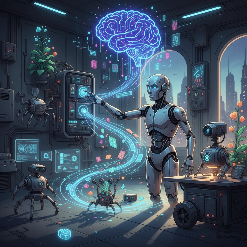 הדבר הכי מרגש שקרה השנה הוא שהבינה המלאכותית, אותה טכנולוגיה חכמה שמאפשרת למחשב לכתוב סיפורים או לצייר ציורים, קיבלה סוף סוף גוף. במקום רק לדבר על שטיפת כלים, היא עכשיו יכולה להפעיל רובוט שישטוף אותם. המומחים קוראים לזה "בינה מלאכותית פיזית", וזה אומר שהמחשבים החכמים מתחילים לפעול בעולם שלנו, ממש כמונו.