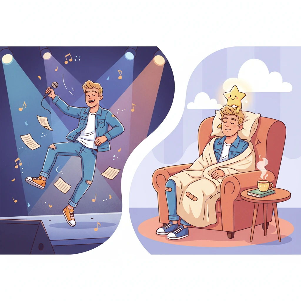 הָרוֹפְאִים אָמְרוּ לְגַ'סְטִין מַשֶּׁהוּ חָשׁוּב. הֵם אָמְרוּ שֶׁהוּא לֹא יָכוֹל לִרְקֹד וְלִקְפֹּץ עַכְשָׁו. הָרֶגֶל שֶׁלּוֹ צְרִיכָה שֶׁקֶט. הִיא צְרִיכָה לָנוּחַ כְּדֵי לְהִתְחַזֵּק. לָכֵן, גַ'סְטִין הָיָה צָרִיךְ לְבַטֵּל כַּמָּה הוֹפָעוֹת. הוּא הָיָה קְצָת עָצוּב. הוּא מְאוֹד רָצָה לִפְגֹּשׁ אֶת הַמַּעֲרִיצִים שֶׁלּוֹ. אֲבָל הוּא יָדַע שֶׁהַבְּרִיאוּת הֲכִי חֲשׁוּבָה. זֶה כְּמוֹ שֶׁמְּבַטְּלִים יְצִיאָה לַגִּנָּה כְּשֶׁיּוֹרֵד גֶּשֶׁם. קֹדֶם כֹּל, צָרִיךְ לִשְׁמֹר עַל עַצְמֵנוּ. עַכְשָׁו גַ'סְטִין נָח בַּבַּיִת שֶׁלּוֹ. הוּא קוֹרֵא סְפָרִים, רוֹאֶה סְרָטִים וְנוֹתֵן לַגּוּף שֶׁלּוֹ לְהַחְלִים.