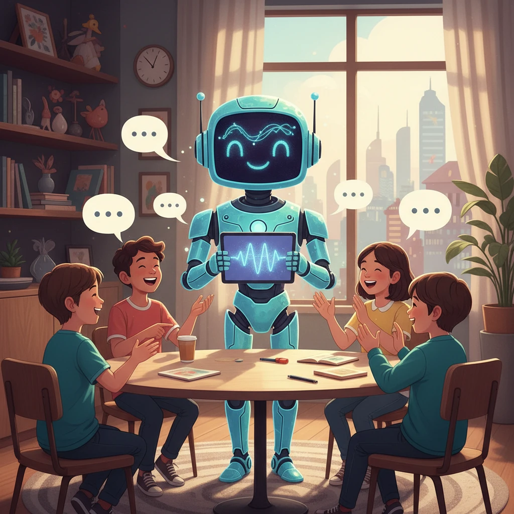 צ'ָאט קְבוּצָתִי הוּא מָקוֹם בַּמַּחְשֵׁב אוֹ בַּטֵּלֵפוֹן. שָׁם הַרְבֵּה חֲבֵרִים יְכוֹלִים לִכְתֹּב זֶה לָזֶה. אֶפְשָׁר לִשְׁלֹחַ הוֹדָעוֹת וּתְמוּנוֹת. זֶה כְּמוֹ לְשַׂחֵק בְּיַחַד, אֲבָל בְּלִי לָצֵאת מֵהַבַּיִת. עַכְשָׁו, הַמַּחְשֵׁב הֶחָכָם יָכוֹל לְהִצְטָרֵף לַמִּשְׂחָק. הוּא מַקְשִׁיב לַשִּׂיחָה וְעוֹזֵר כְּשֶׁמְּבַקְּשִׁים מִמֶּנּוּ.